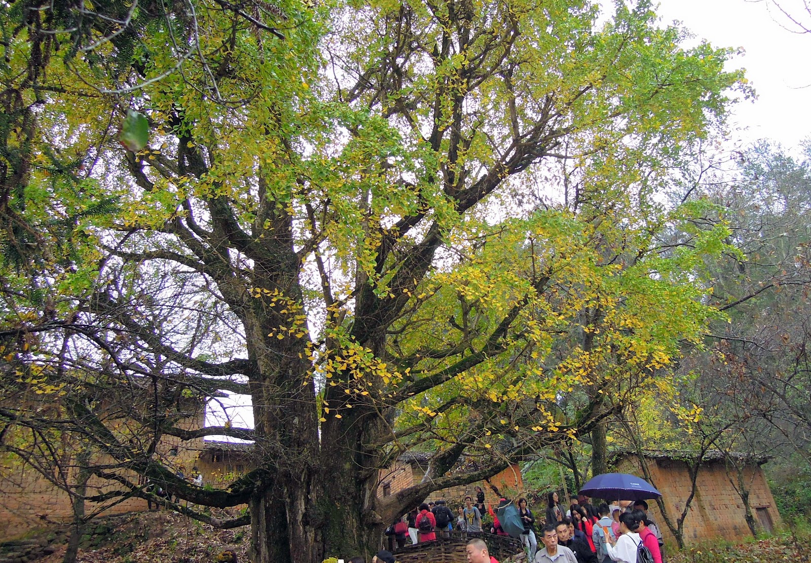 古村遊人特別多,千年銀杏也稀疏.編成花冠頭上戴,人人見了笑呵呵.